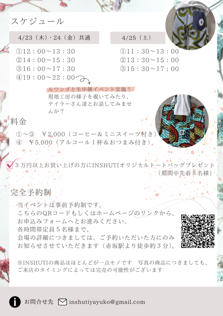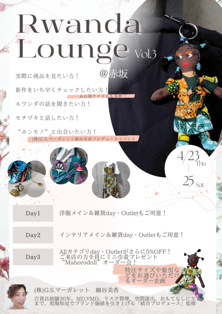 3回目となるRwanda Lounge。先月ルワンダに渡り買い付けたばかりの新商品や、特別企画をご用意してお待… 続きを読む: Rwanda Lounge vol.3開催決定のおしらせ - 新作!イチ押し!サロペットワンピース