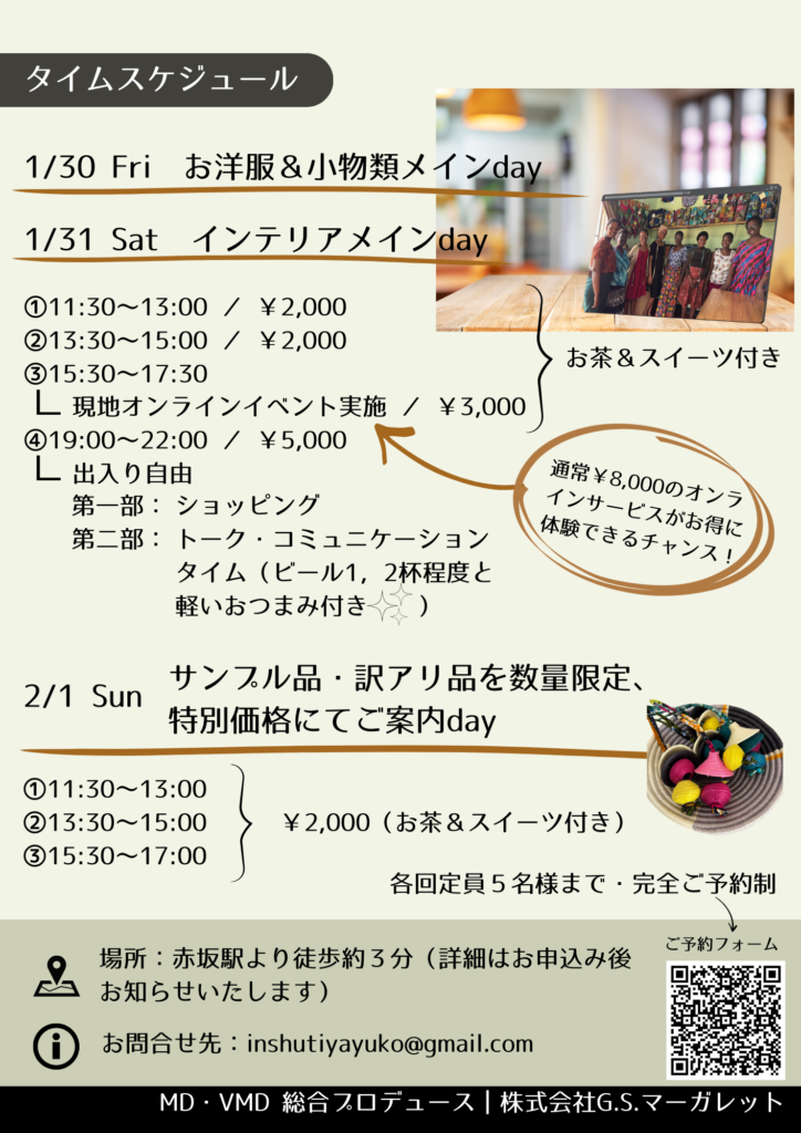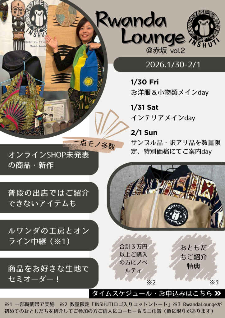 また、1日目・2日目の一部の時間帯では、ルワンダとオンライン通信!INSHUTIの商品を数多く製作してくれていている工房KOMERA CREATIVEとお繋ぎします。